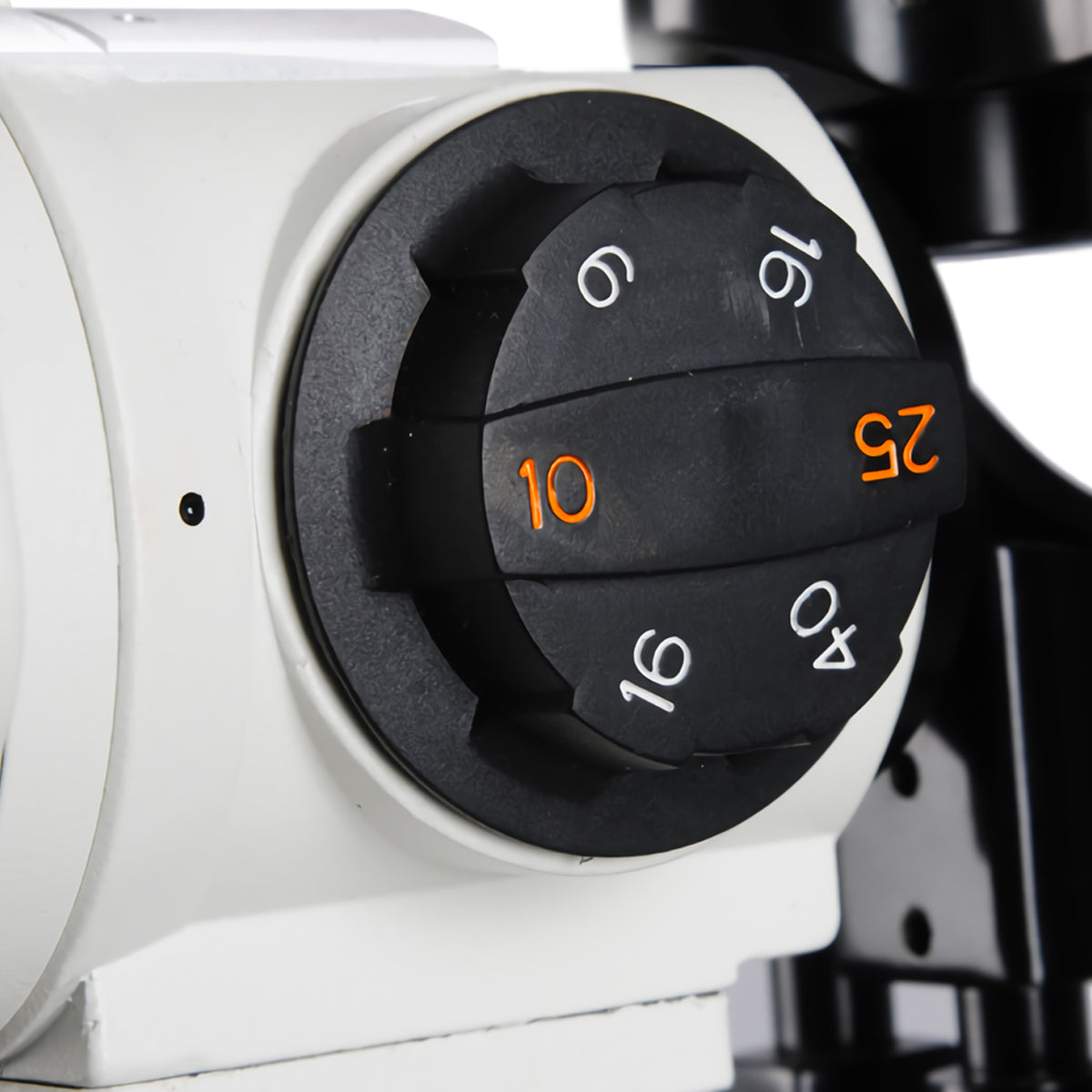 Seletor de Ampliação A Lâmpada de Fenda SL-1400 da Luxvision oferece a possibilidade de selecionar cinco níveis de ampliação — de 6x até 40x — simplesmente girando um único botão. Não é necessário trocar a ocular. Utilizando o botão convenientemente localizado, os operadores podem escolher entre taxas de ampliação equivalentes a 6x (Ø33mm), 10x (Ø22.5mm), 16x (Ø14mm), 25x (Ø8.8mm) e 40x (Ø5.5mm). Ajustes finos também podem ser feitos no PD e na correção óptica. |